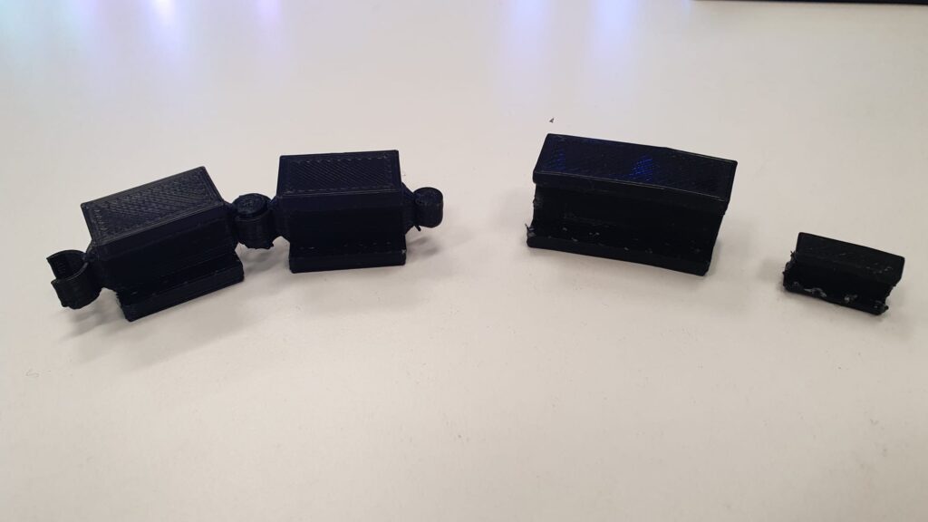 Aan de rechterkant zie je een kleine 3D print en een grotere (rechter 2). Deze prints zijn gemaakt om te kijken hoe groot het er in de werkelijk uitkomt. Het principe van het rechter idee is dat je een stukje hebt die je met een soort puzzelvorm aan elkaar kunt maken. Hierbij zou de stroom dan over een magneet aansluiting gaan.